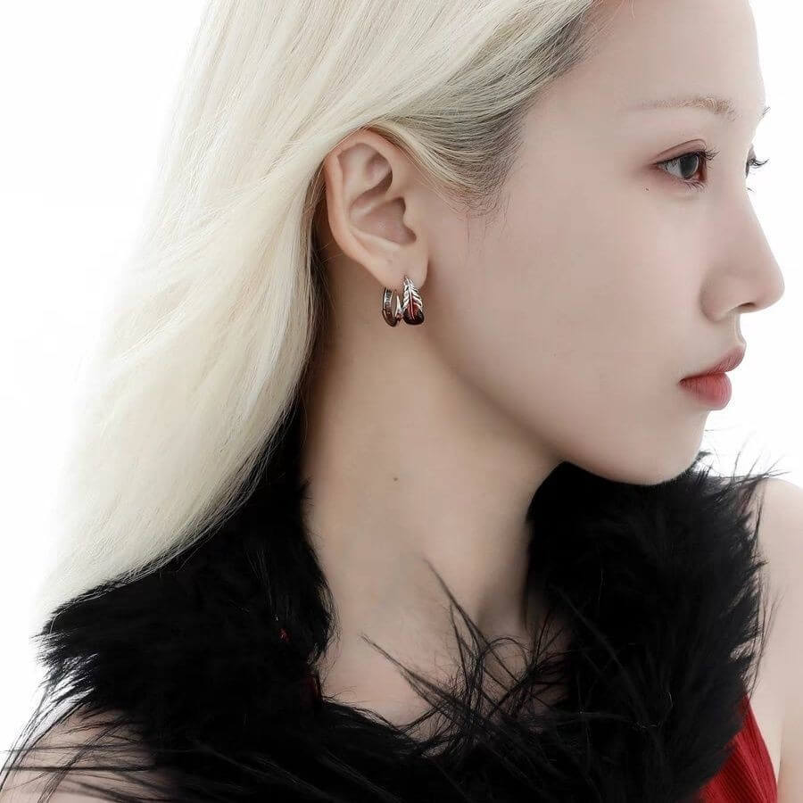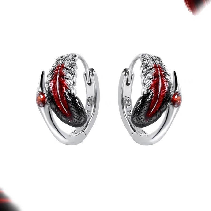 Eine einzelne Feder, getaucht in flüssigen Rubin, die den Hauch des Mutes vom letzten Flug eines Phönix in sich trägt. Sie ruht an deinem Ohr wie ein geschmolzenes Geheimnis – ein Zeugnis von Schönheit, geschmiedet im Feuer, bereit, deine Silhouette mit stiller, trotziger Anmut zu erleuchten.