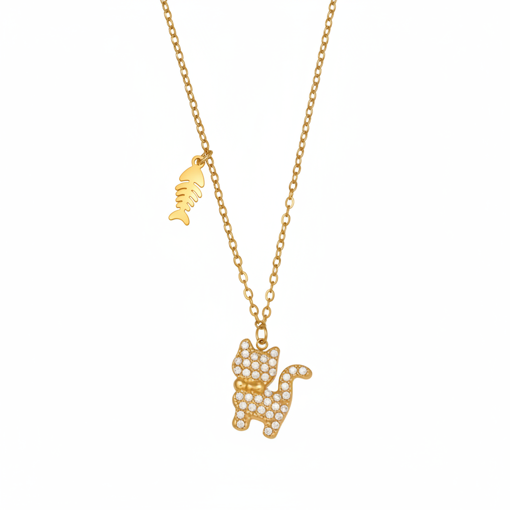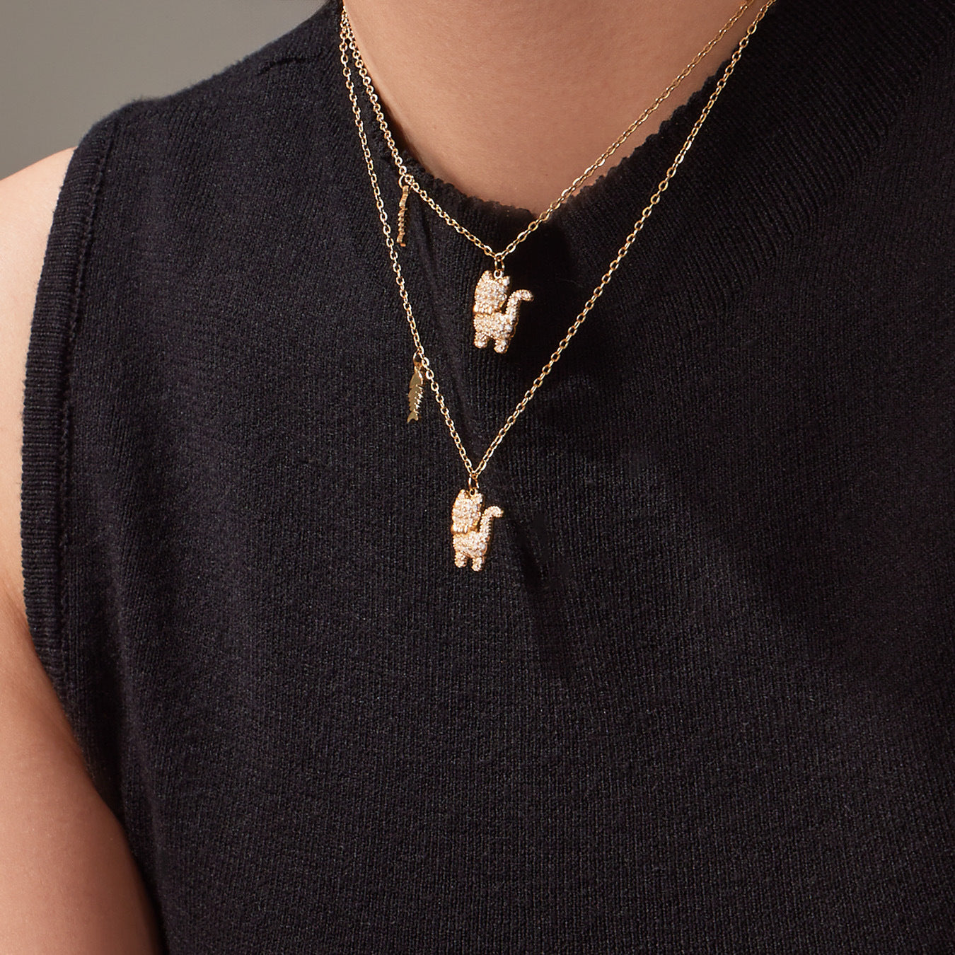 Dieser verspielte Anhänger fängt die stille Unterhaltung zwischen einem neugierigen Kätzchen und seiner begehrten Beute ein. Die elegante Katzensilhouette mit einem funkelnden Zirkonauge ruht neben einer zarten Fischgräte – ihrem silbernen Snack für immer. Gefertigt aus leichtem Edelmetall, schenkt er jedem Tag einen Hauch von Verspieltheit. Das Schmuckstück zelebriert eine geheime Verbundenheit und die unbeschwerte Freude an einem spielerischen Abenteuer und ist ein charmantes Symbol unbeschwerter Freundschaft.
