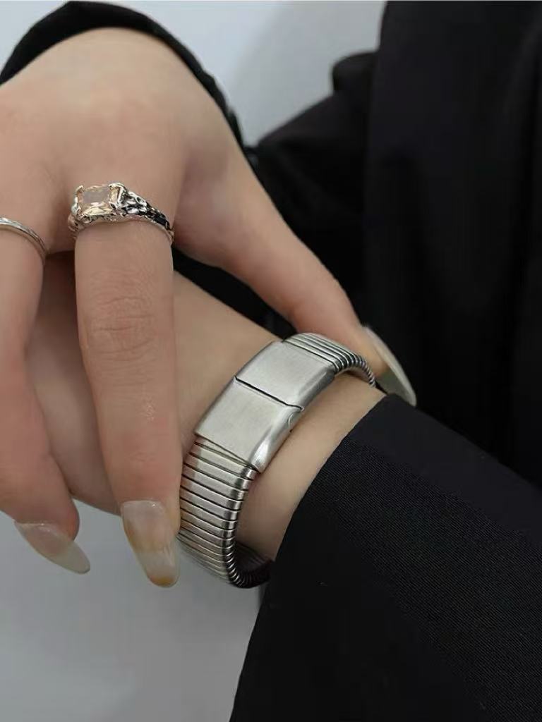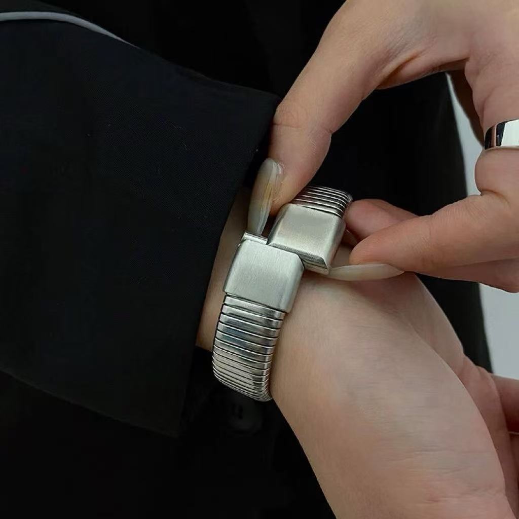 Crafted from solid titanium steel, this vintage snakebone cuff features a raw, distressed finish. Its bold, articulated design moves with you, adding instant edge to any look. Durable, hypoallergenic, and effortlessly cool—a timeless piece for your streetwear arsenal.